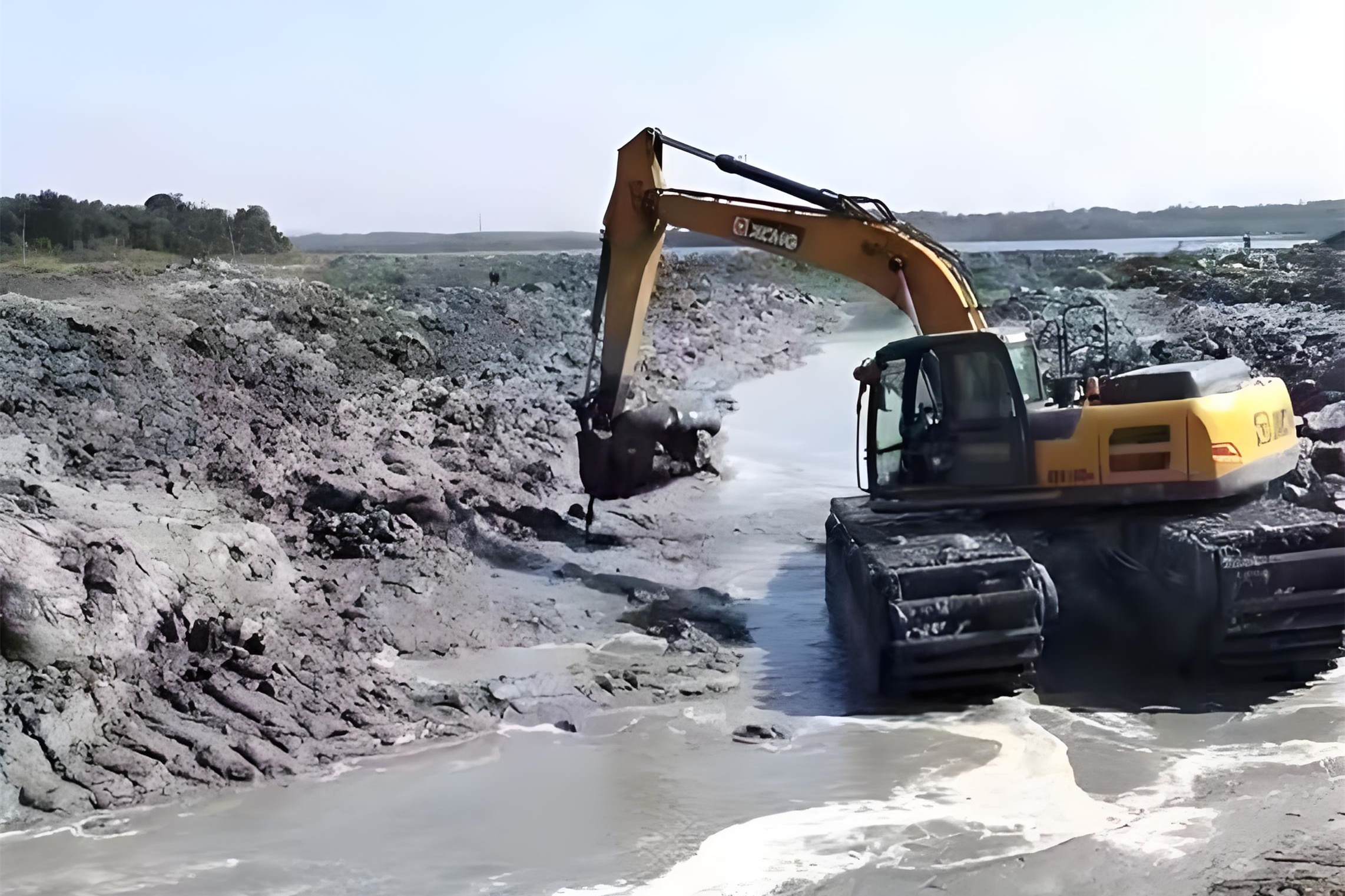 淤泥的粘稠度也很影響。稀泥像粥一樣,挖斗一挖就能提上來,速度快;要是淤泥里混著硬土塊、碎石,甚至有樹根纏繞,挖斗得反復(fù)撬動,還容易卡料,效率起碼打五折。